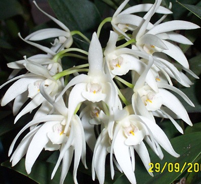 A relatively large Dockrillia in Harmon, more ‘Newbees’ Parchment white, a hint of pink with 30mm plus wide curly bloom, with the typical totally recurved lip. Dad also in the ‘Newbee’ stakes a strong grower with a soft mustard yellow flower, unlike Dock. chrysantha, but has the segments pretty flat. Expecting something just a little bit different and lots of flowers as ‘Mark’ carried around the 15 plus blooms. Thanks Irene for the suggestion.