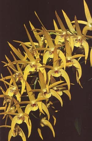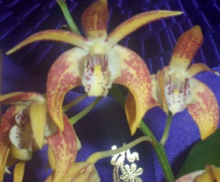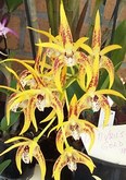 ‘Huge’ a relatively shy breeder, gets a mention in the Hermon Slade judging with its golden yellow base colour and maroon/red solid and spray can markings, 6 to 8 blooms on a raceme and can flower up to 3 sometimes 4 occasions in 12 months. Now