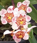 ‘Funny Face’, well rounded beauty with a ivory white base colour having pink blotching on the S & P’s with rings around the centre of the blooms being orange/red, & a yellow lip. ‘Seven’ (Reefer x Red Snow) has excellent shape, good flower count & an intense red centre. Result, even funnier face, & more flowers on the spike. Plus Red Snow can do wonders with the original colours. Varietal name given to it as it has colorations /patterns similar to our Goleta (California) friends cat, also named ‘Funny Face’ .
